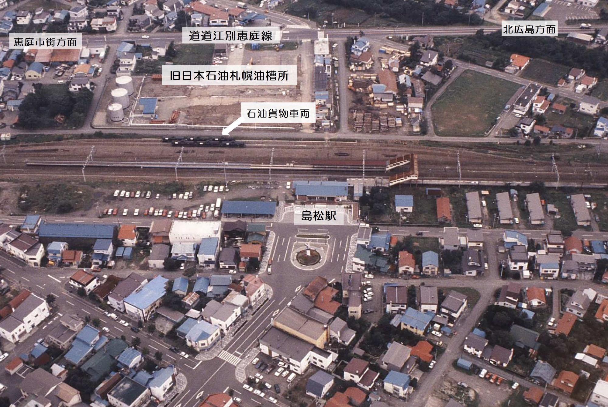 この写真は、昔の島松駅を上空から撮影したものです。現在トライアル恵庭島松店のある場所には、日本石油札幌油槽所の石油貯蔵施設があり、1997年頃まで、苫小牧から石油を列車で運んでいました。写真には、留置線に停まっている「黒い横長のタンク」(石油貨物車両)が連なっているのが見えます。また、ほかに恵庭農協の倉庫などにも専用線を敷設して、荷物を運び入れている時期もあったそうです。