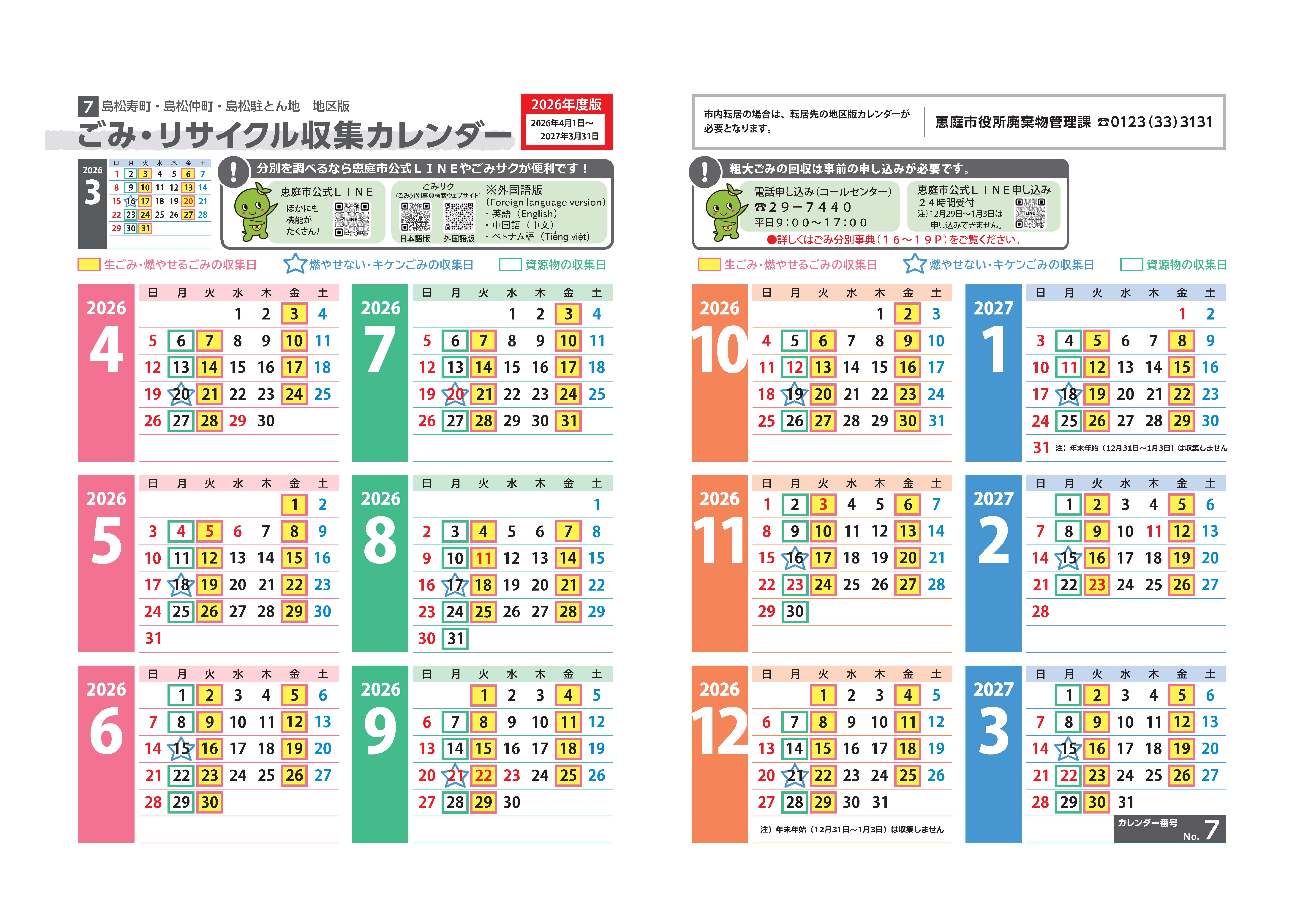 2026年度版(2026(令和8)年4月~2027(令和9)年3月)のごみ・リサイクル収集カレンダーです。
