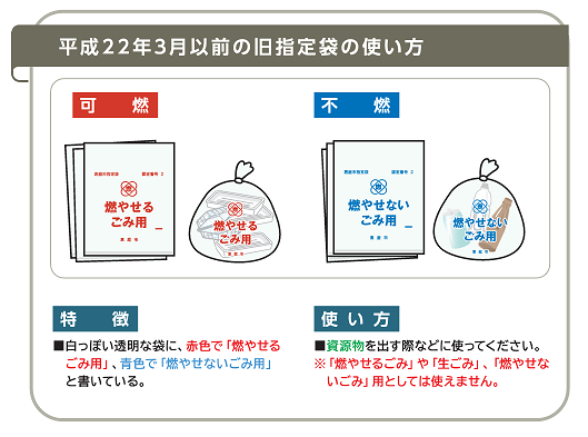 2010年3月以前の旧指定袋(半透明で、文字の色が赤色又は青色)は、資源物を出す際に使用できますので、ご活用ください。(ごみ分別事典P49参照)