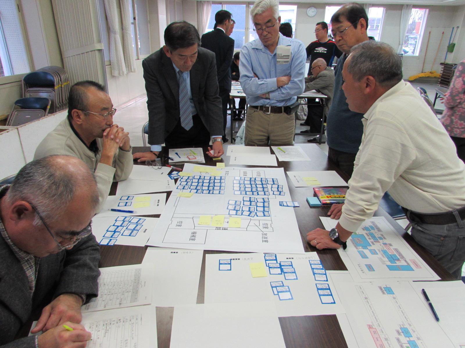 第1回の学習会で作成した避難所レイアウトを用いて、「Doはぐ」による図上演習を行い、避難所運営の課題への対応について、意見を交わしました。