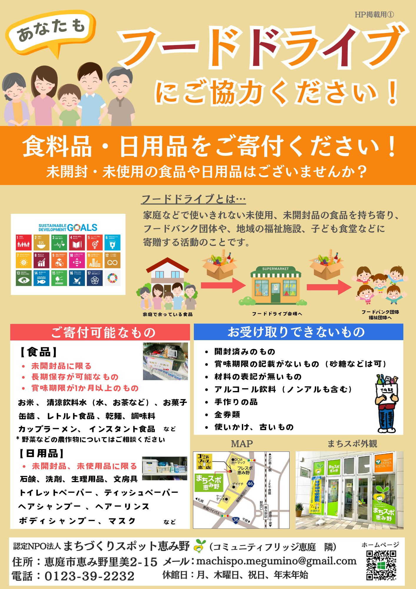 認定NPO法人まちづくりスポット恵み野(フレスポ恵み野内 恵み野里美2-15コミュニティフリッジ恵庭隣)にご持参ください