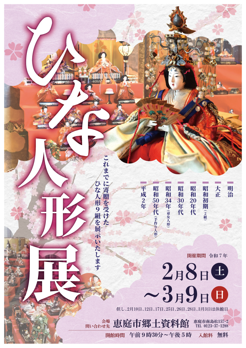 これまでに寄贈を受けたひな人形9組(明治・大正・昭和初期・昭和20年代・昭和30年代・昭和34年童女人形・昭和50年手作り人形・平成2年)を展示いたします。